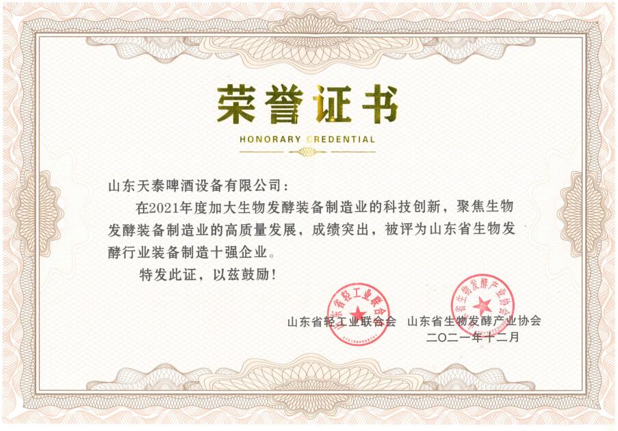 有限公司榮獲2021年“山東省生物發(fā)酵行業(yè)裝備制造十強(qiáng)企業(yè)”的榮譽(yù)稱號(hào)。山東天泰啤酒設(shè)備有限公司(Shandong Tiantai Beer Equipment Co., Ltd)是專業(yè)的啤酒飲料設(shè)備制造商,是啤酒飲料工程項(xiàng)目解決方案提供商和服務(wù)商。公司主要為各類中大型精釀啤酒廠、中型工業(yè)啤酒廠以及科研院所提供全套啤酒生產(chǎn)所需裝備和服務(wù),包括糖化車間裝備、發(fā)酵車間裝備、酵母擴(kuò)培系統(tǒng)、自動(dòng)化控制系統(tǒng)、CIP清洗系統(tǒng)等。同時(shí),公司也生產(chǎn)加工高品質(zhì)果酒設(shè)備、蒸餾設(shè)備和生物發(fā)酵工程設(shè)備等,實(shí)現(xiàn)以發(fā)酵技術(shù)為中心多領(lǐng)域發(fā)展的經(jīng)營模式。